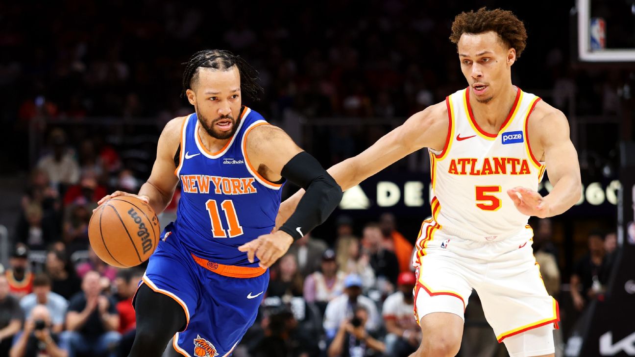 Jalen Brunson goes chef's kiss on dagger 3 as Knicks coast to victory to tie series 2-2