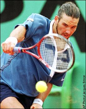 Patrick Rafter of Australia returns a backhand to Gianluca Pozzi of Italy during their first round match at the French Open. Rafter defeated Pozzi 6-3, 6-1, 6-1.