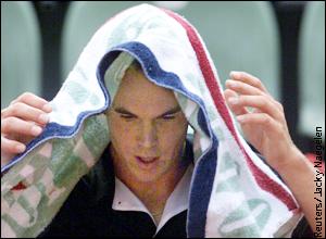 Magnus Norman of Sweden protects himself from rain under a towel during his match of the French Tennis Open against Andrei Medvedev of Ukraine. Norman went on to win 6-0, 6-4, 6-2.