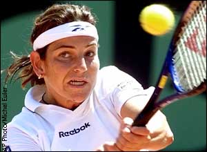 Eighth-seeded Arantxa Sanchez-Vicario of Spain returns a backhand to her compatriot, fifth-seeded Conchita Martinez , during their semifinals match at the French Open. Sanchez-Vicario loss to Marinez 1-6, 2-6.
